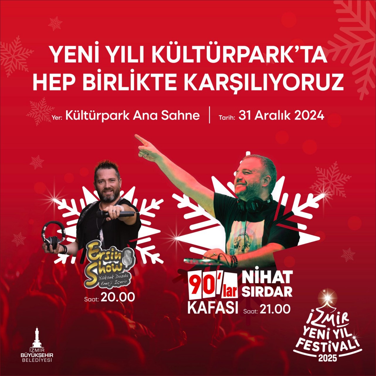 Hediyelik eşya stantları, yeme içme alanları, buz pateni, yaratıcı atölyeler ve İzmir’e özel sahne gösterileriyle sıcacık bir kış atmosferi oluşturan Yeni Yıl Festivali, Kültürpark’ta ziyaretçileri ağırlamayı sürdürüyor. Her gün 13.00-22.00 saatleri arasında yerel ve ulusal sanatçılarla müzik dinletileri ve konserler, dans, ritim şovları, ateş ve sirk sanatları gösterileri ve karaoke etkinliklerinin yapıldığı festival, muhteşem bir yılbaşı gecesi etkinliği ile taçlanıyor. Kültürpark Ana Sahne’de saat 17.00’de soft rock müzikle tanınan Grup E) Hiçbiri, 18.00’de pop müzik sevenler için Grup Lambda, 20.30’da müzik, dans ve interaktif gösteri ile Ersin Show, 22.00’de ise Nihat Sırdar 90’lar Kafası var. Ünlü radyo programcısı Nihat Sırdar, 90’ların unutulmaz parçalarını DJ setinden dinlemek isteyenleri dans ve eğlence dolu bir gecede coşturacak.