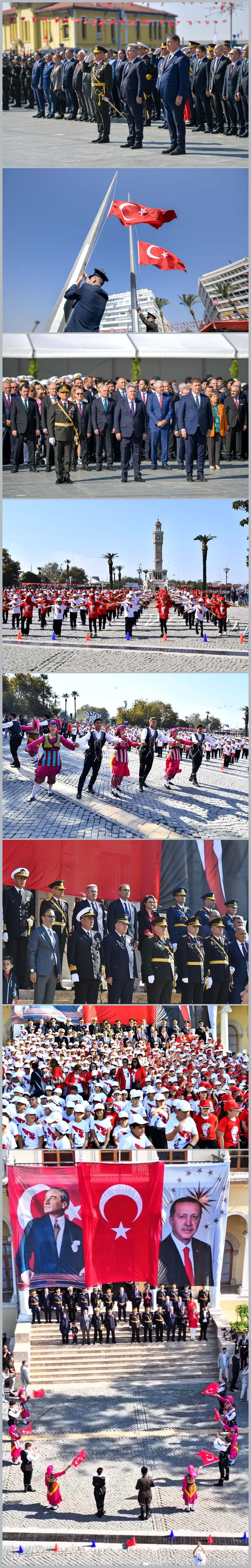 29 Ekim Cumhuriyet Bayramı’nın 101’inci yıl dönümü için Cumhuriyet Meydanı’nda çelenk sunma töreni gerçekleştirildi. Törenin ardından İzmir Valiliği önünde kutlama etkinliği de yapıldı. Cumhuriyet Meydanı’ndaki Atatürk Anıtı’na çelenk sunma töreninde İzmir Valisi Dr. Süleyman Elban, İzmir Büyükşehir Belediye Başkanı Dr. Cemil Tugay, Ege Ordusu ve Garnizon Komutanı Orgeneral İrfan Özsert’in yanı sıra İzmir milletvekilleri, ordu ve emniyet mensupları, oda, dernek ve sivil toplum kuruluşlarının temsilcileri yer aldı. Marşlar eşliğinde düzenlenen törende gençler dev Türk bayrağı açtı.