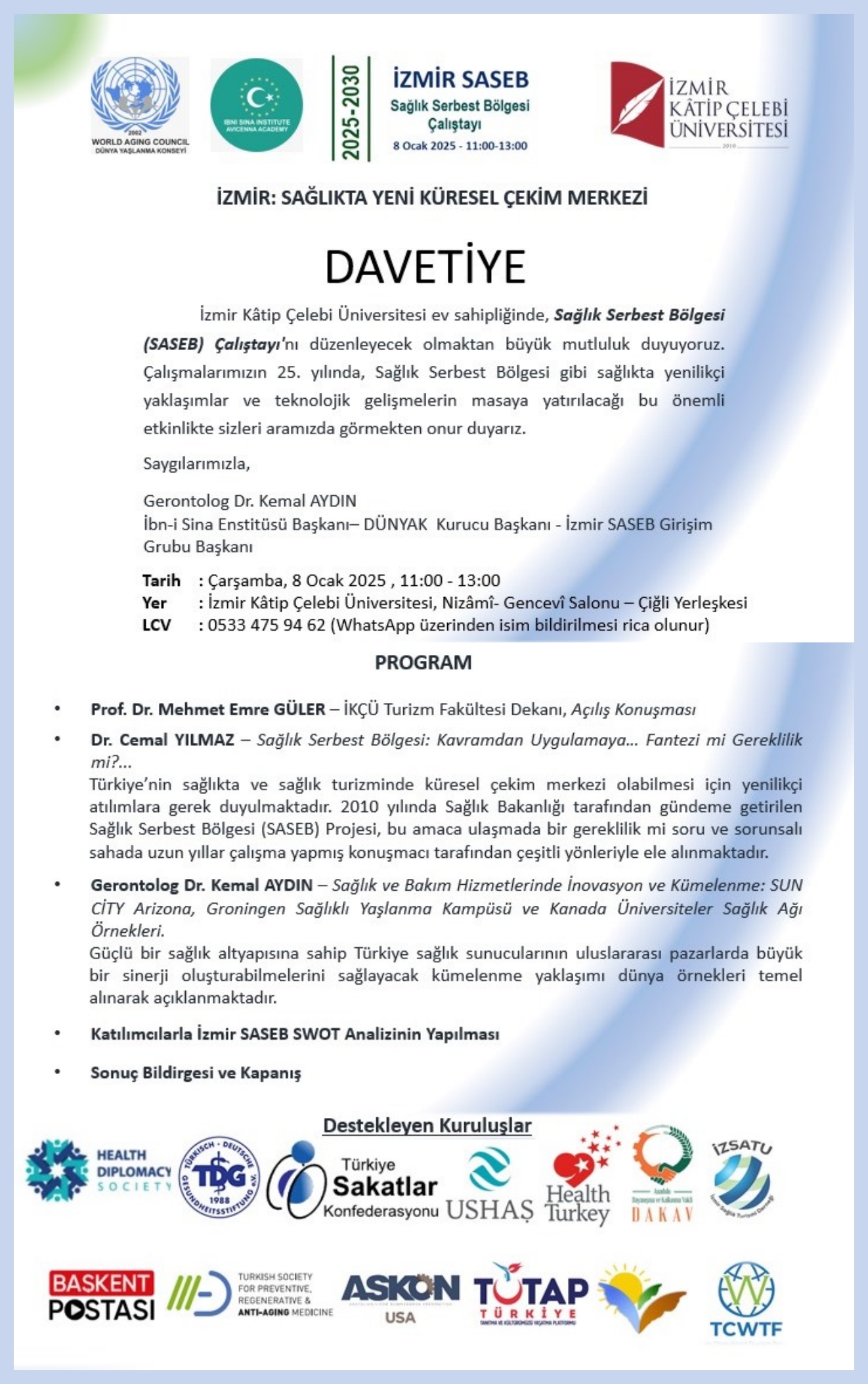 Bilim insanları, bölge milletvekilleri, kamu yöneticileri, sektör temsilcileri ve yatırımcıların yanı sıra konuyla ilgilenen pek çok paydaş çalıştaya katılım sağlayacak. Organizasyon, İbn-i Sina Enstitüsü ve Dünya Yaşlanma Konseyi iş birliğiyle düzenleniyor. Çalıştayın, İzmir’i sağlık turizmi alanında uluslararası bir marka haline getirecek stratejilerin belirlenmesine öncülük etmesi bekleniyor.