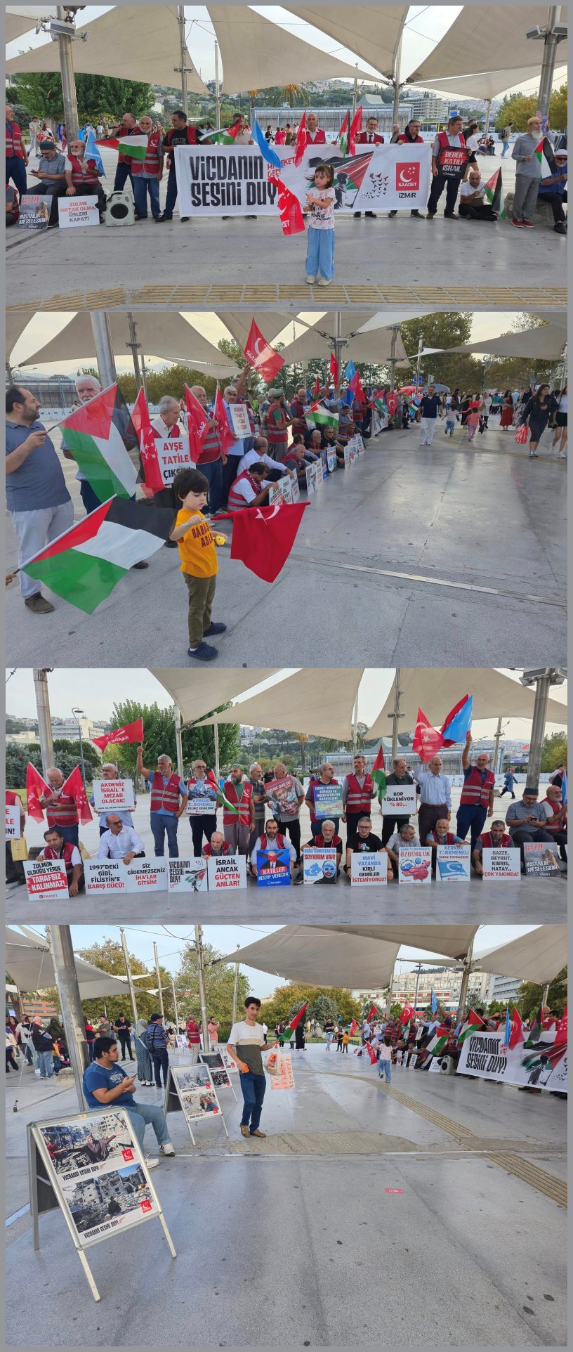 Filistin’in haklı davasına destek veren ezgiler eşliğinde her hafta gerçekleştirilen eylemde, ellerinde Türkiye ve Filistin bayrakları ile mazlum Filistin halkına destek mesajları içeren döviz ve pankartlar taşıyan Saadet Partililer, katil İsrail'in Gazze'ye yönelik saldırılarını ve katliamlarını kınıyor. Saadet Partililer, İzmir Konak İskelesi tramvay durağı çıkışında “Vidanın sesini duy! Harekete geç!” mesajının ön plana çıkarıldığı büyük bir pankartın yanı sıra "Zulmün olduğu yerde tarafsız kalınmaz! Gazze insanlık meselesidir! Bebek katili İsrail! Ayşe Tatile çıksın! Akdeniz İsrail’e mezar olacak!1997’deki gibi Filistin’e barış gücü! Katiller hesap verecek! İsrail ancak güçten anlar! Katiller hesap verecek! İsrail’i koruyan Kürecik ve İncirlik üsleri kapatılsın! Gazze, Beyrut, Kıbrıs, Hatay çok yakında!..” şeklinde ifadelerin yer aldığı dövizlerle yoldan geçen vatandaşları karşılıyorlar.