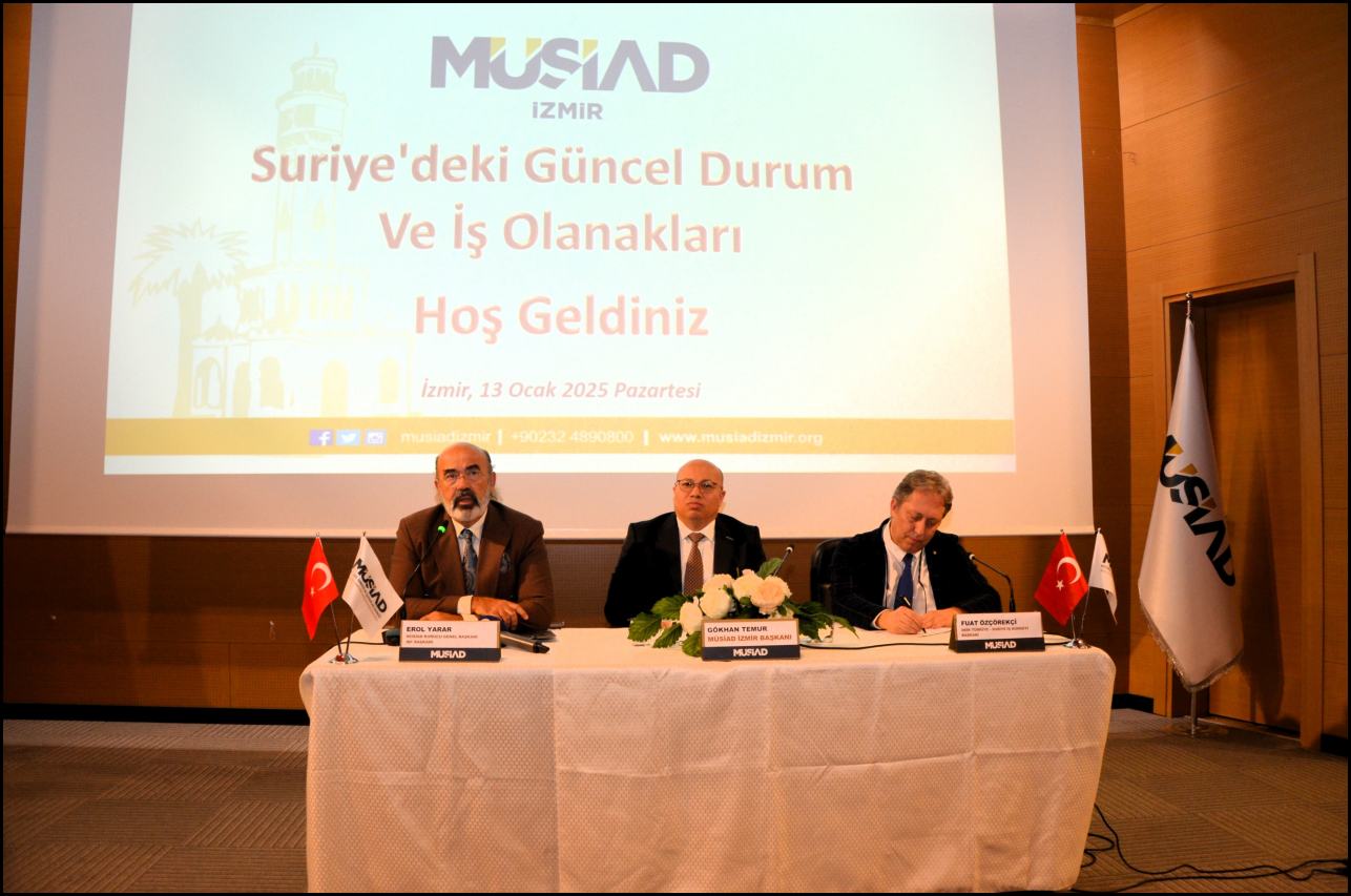 Müstakil Sanayici ve İşadamları Derneği (MÜSİAD) İzmir Şubesi, “İzmir Buluşmaları” kapsamında düzenlediği toplantıda, Suriye’nin yeniden inşa sürecindeki ekonomik fırsatlar ve Türkiye-Suriye iş birliği olanaklarını ele aldı. Bilal Saygılı Cami Külliyesi – Ertuğrul Gazi Konferans Salonu’nda gerçekleştirilen toplantıya, kamu temsilcileri, iş dünyasının önemli isimleri ve sivil toplum kuruluşları yoğun ilgi gösterdi.