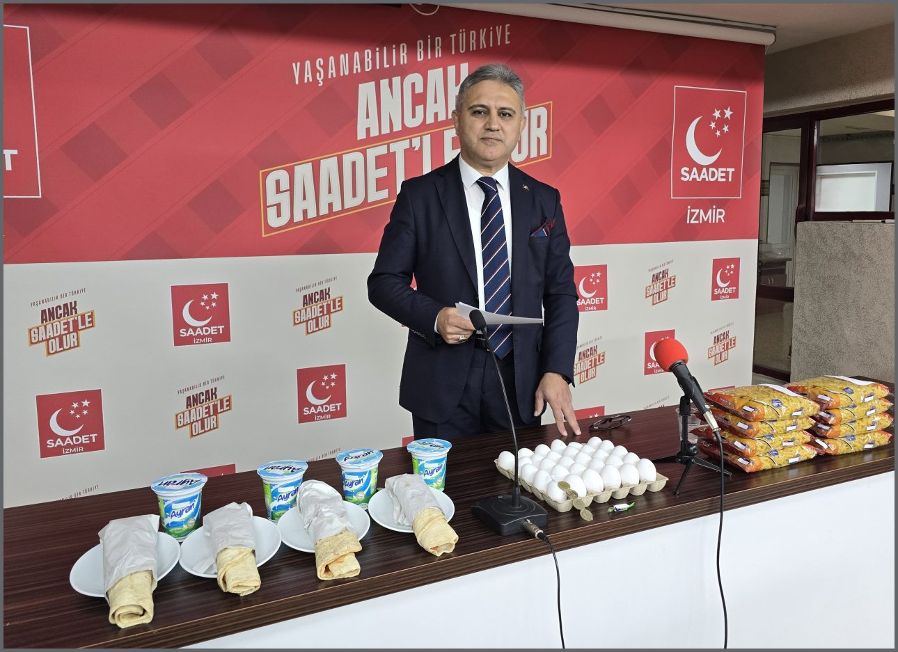 Saadet Partisi, 2025 yılı için açıklanan 22.104 TL asgari ücrete tepki göstermek amacıyla tüm illerde eş zamanlı basın açıklamaları gerçekleştirdi. İzmir İl Başkanı Mustafa Erduran, açıklanan rakamın sonundaki 4 TL’ye vurgu yaparak, bu tutarın geçmişte neler alınabildiğini masada sergilediği ürünlerle anlattı. Erduran, “2002 yılında 4 TL ile 8 paket makarna, 30 adet yumurta ve 4 dürüm-ayran alınabiliyordu. Bugün ise aynı 4 TL ile bir sakız dahi alınamıyor” dedi.